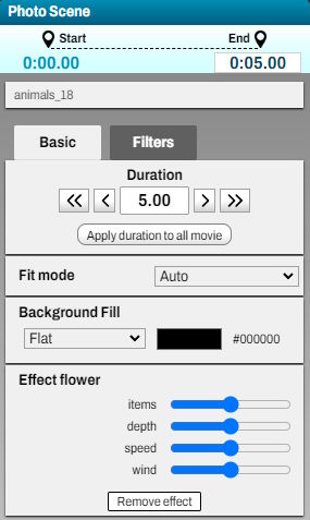 Finally, if the scene includes an effect, you have settings to choose the number of elements, their speed, and their movement.