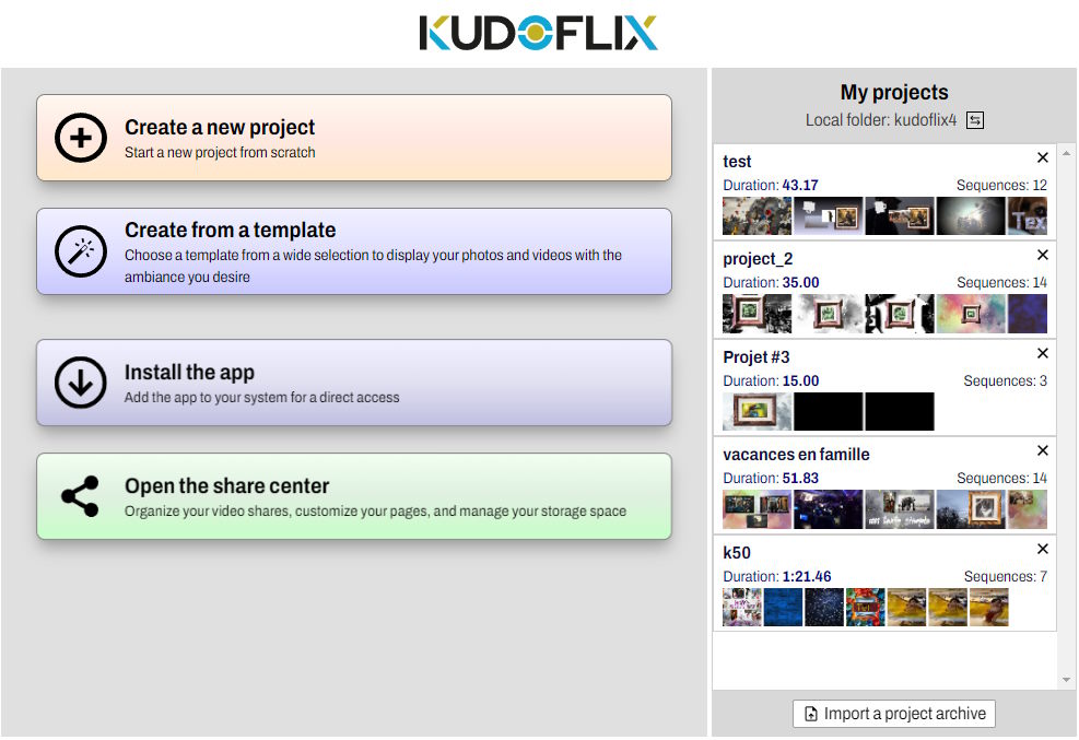 This is useful, for example, when you want to continue working on your project on another computer or if you have lost the contents of the Kudoflix work directory.