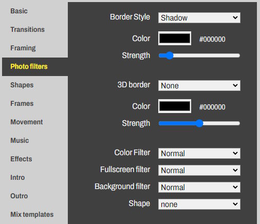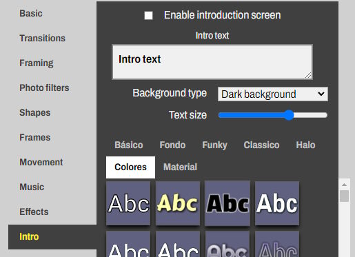 * Slides without media: To choose whether there will be scenes without media. This means scenes that just contain the background with the ambiance. This allows for pauses in your film and perhaps leaves room for adding other elements like text or clips.