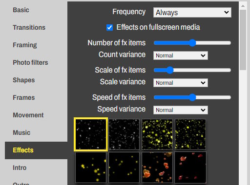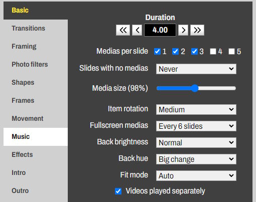 * Media per slide: You can choose the number of photos/videos that will be displayed per scene. If you check for example 1 and 5, this means that there will randomly be scenes containing a single photo or video and scenes containing exactly 5 elements.
