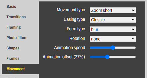 Zoom factor in shapes: Level of zoom of the original image; the more zoomed in, the more amplitude in the zoom and movements of the animation.