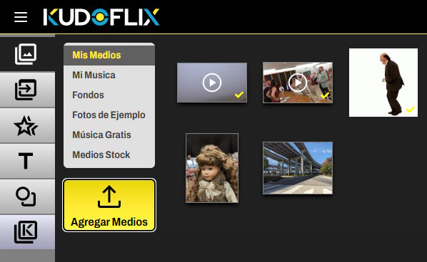 Aquí tienes una primera categoría 'Mis Medios', donde se muestran tus propias fotos, videos y elementos que agregas a tu proyecto.