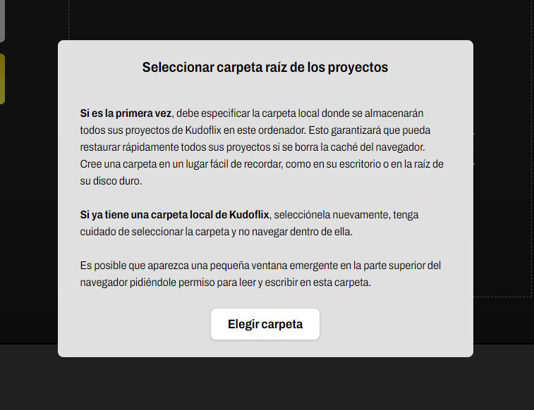 Cuando te suscribes o ya estás suscrito y la caché del navegador ha sido borrada, aparece una pequeña ventana para pedirte la ubicación del directorio de trabajo de Kudoflix.
