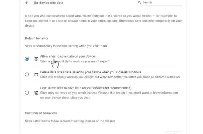 Si no encuentras tus proyectos cuando vuelves a Kudoflix, verifica en las opciones de tu navegador, buscando la opción 'Datos de sitios en el dispositivo' para ver si no está configurada para eliminar todos los datos al cerrar el navegador.