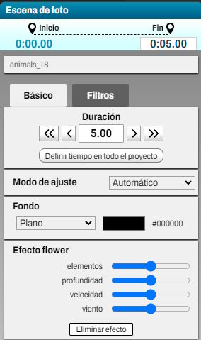 Por último, si la escena tiene un efecto, tienes ajustes para elegir el número de elementos, su velocidad y su movimiento.