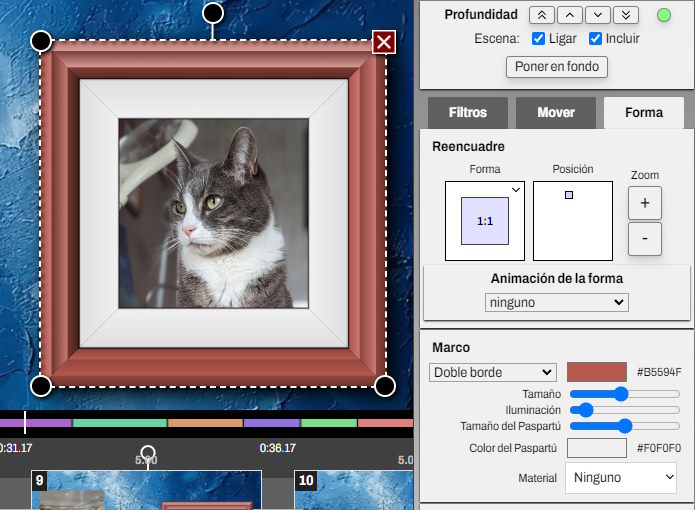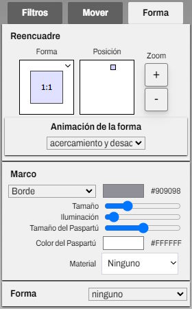 Este espacio permite definir una forma y una decoración en un elemento de foto o video.