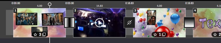Puedes hacer doble clic en la escena para entrar en el editor de escenas. También se indica el nombre de los elementos adjuntos a esta escena. La estrella indica que se ha aplicado un efecto en esta escena.