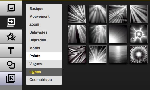 De nombreuses transitions sont disponibles et sont classées par catégorie.